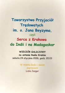 W ostatnią niedzielę stycznia obchodzony jest Światowy Dzień Chorych na Trąd – święto ustanowione w 1954 roku przez Raoula Follereau. Choć wielu osobom trąd kojarzy się z odległą przeszłością, choroba wciąż istnieje i dotyka milionów ludzi. O tym, jak wygląda dziś pomoc chorym i dlaczego Kraków ma w tej historii swoje szczególne miejsce, opowiadali w audycji „Wieczór Galicjowy” Elżbieta i Wojciech Jastrzębscy z Towarzystwa Przyjaciół Trędowatych im. bł. o. Jana Beyzyma – organizacji pożytku publicznego działającej przy krakowskich jezuitach.